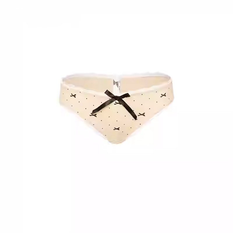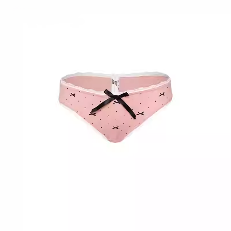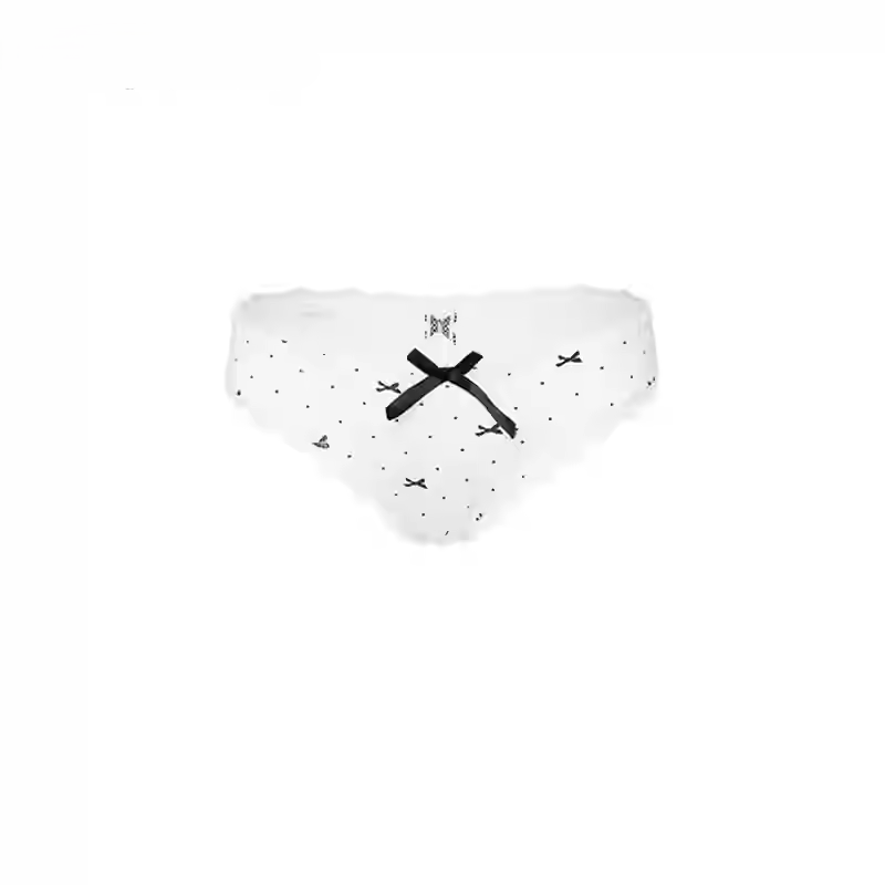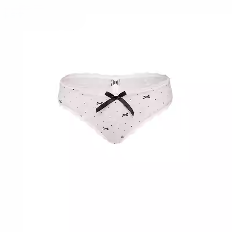 Soft cotton fabric meets sweet ribbon detailing in this ultra-feminine underwear. Featuring tiny dot and bow prints with lace edges and rear crisscross trim, it brings together playful innocence and subtle charm. Available in multiple pastel shades for everyday cuteness.