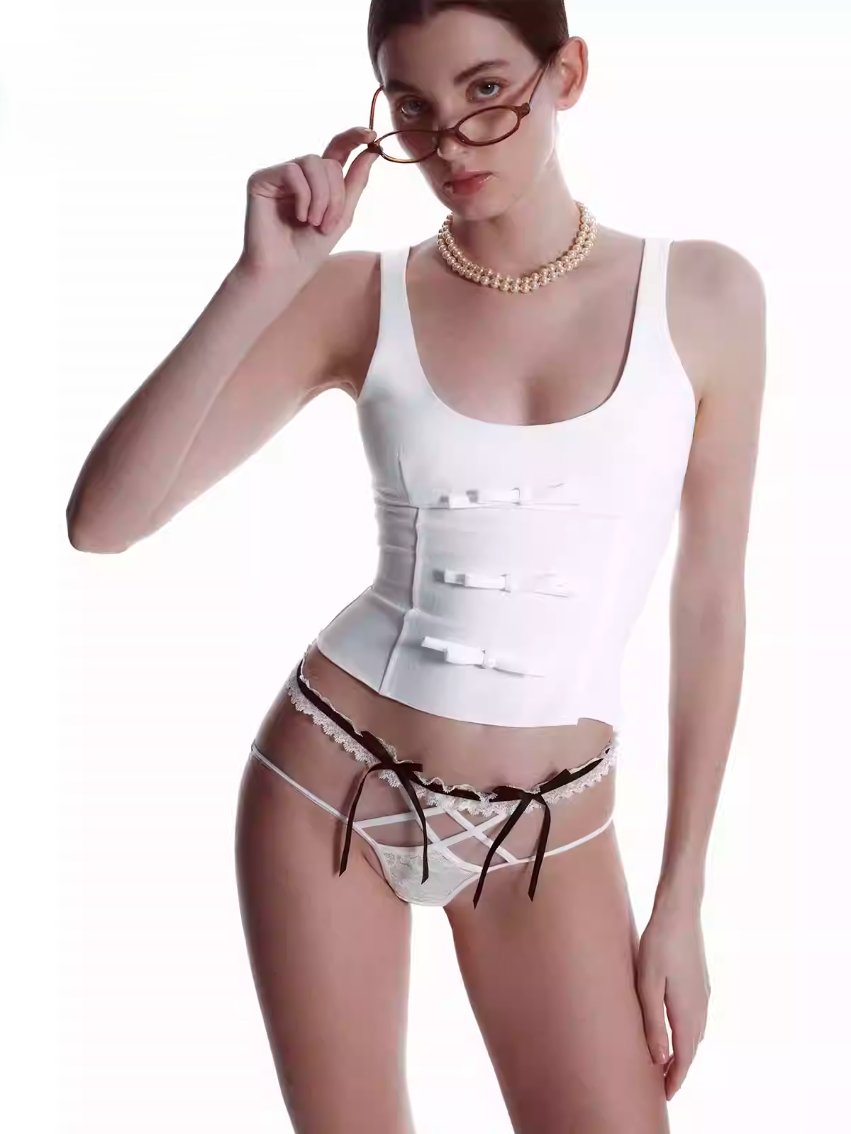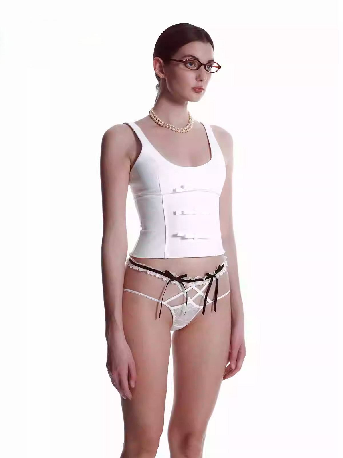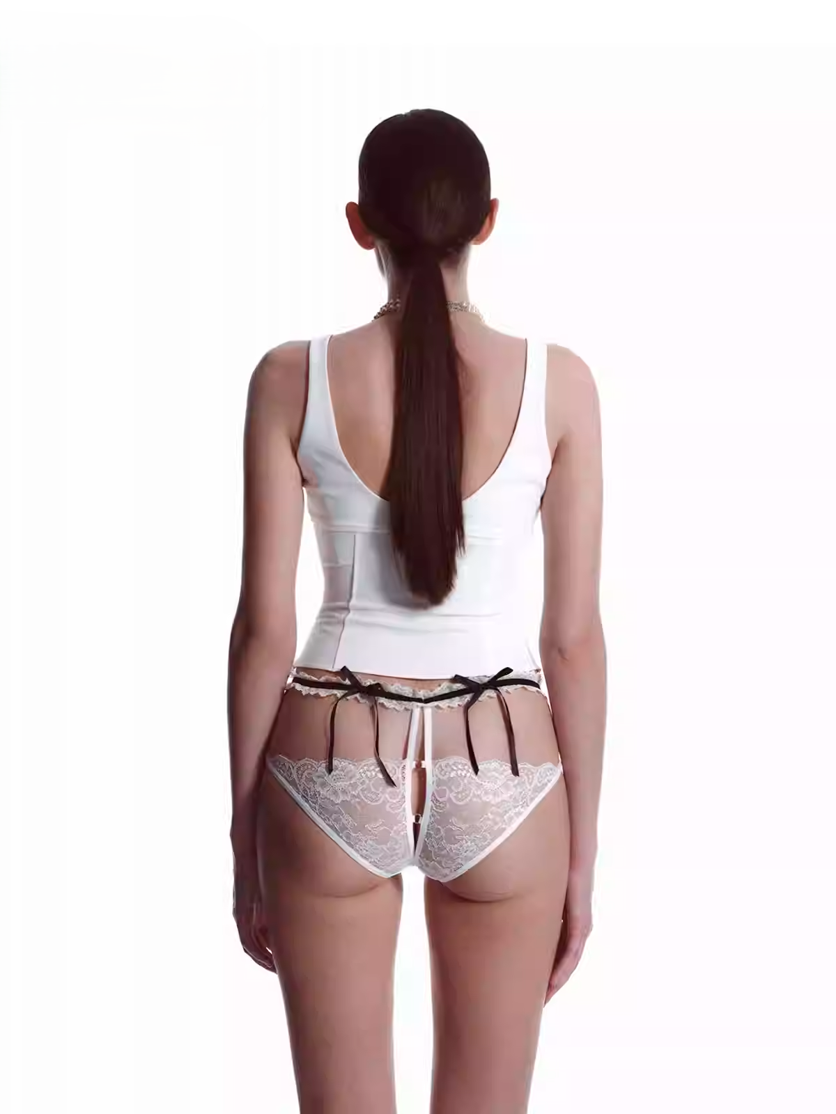 This lace thong features delicate cross straps, contrast black-and-white tones, and playful bow accents. The sheer mesh adds a touch of seduction, while the ruffled waistband and satin ribbons enhance its flirtatious charm. Perfect for expressing bold femininity with an elegant, provocative edge.