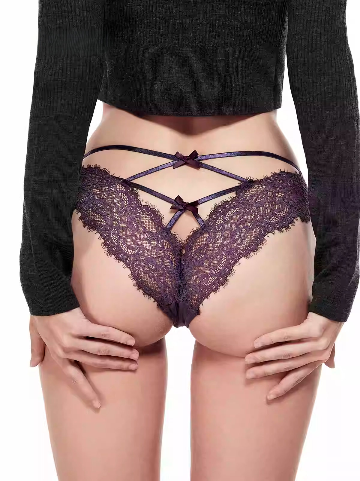 Delicate lace hugs the curves with crisscross straps and double bow accents, creating a charmingly seductive silhouette. Feminine, flirty, and irresistibly bold.